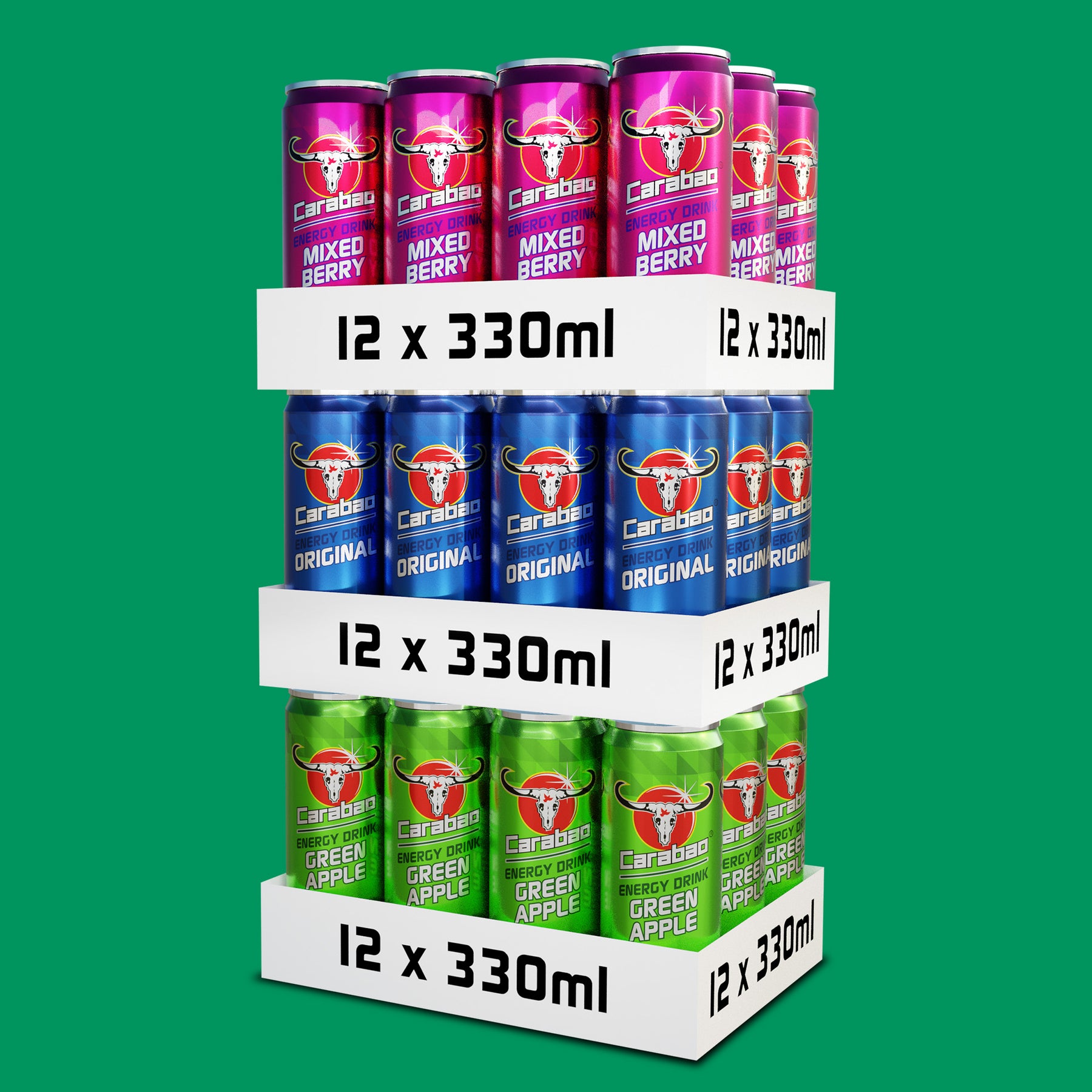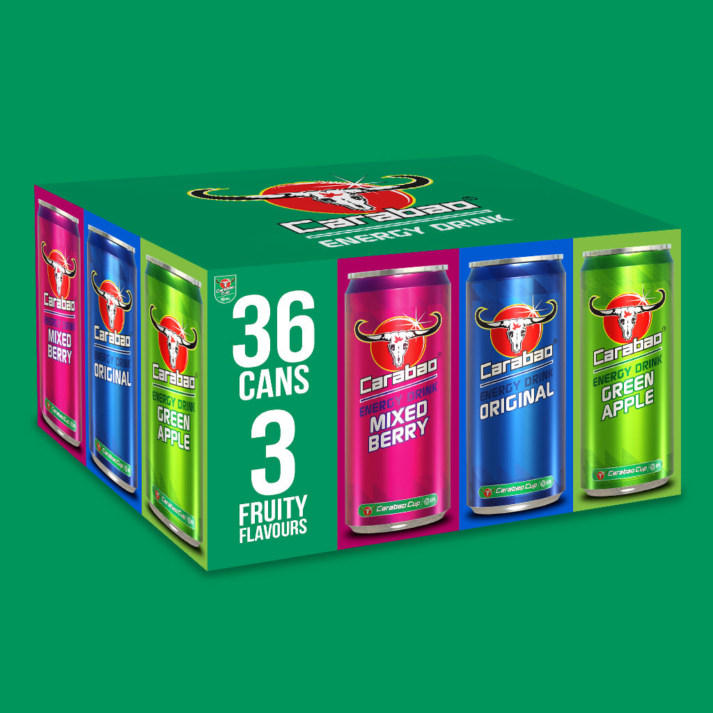 Get 3 Carabao flavours in one pack - a celebration of our classic fruity flavours! 12 x cans of Carabao Energy Drink in each of the following flavours: Original, Green Apple and Mixed Berry. Enjoy our deliciously light and sparkling energy drink bubbling with natural great tasting flavours. Half the sugar of traditional energy drinks and from only 41 calories per can. Contains taurine, caffeine and B vitamins which replenishes energy* and relieves fatigue*. Comes in 36 pack of 330ml each.